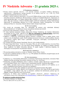 • Za tydzień I niedziela miesiąca – niedziela adoracji Najświętszego Sakramentu. O g. 12.30 Msza św. w intencji Żywej Róży, a po niej spotkanie i wymiana tajemnic różańcowych.