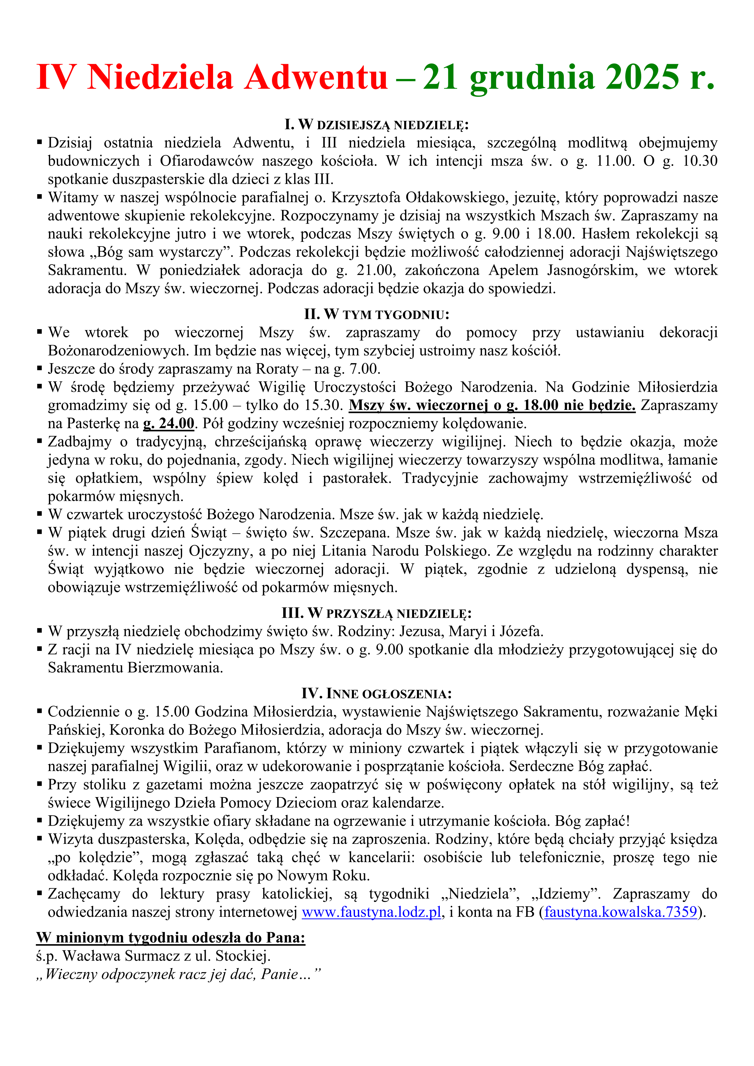 • Zachęcamy do lektury prasy katolickiej, są tygodniki „Niedziela”, „Idziemy” i inne. Można też nabyć paschaliki, jako wsparcie Caritas. Paschaliki możemy przynieść ze sobą na liturgię Wielkiej Soboty. Zapraszamy do odwiedzania naszej strony internetowej faustyna.lodz.pl, i konta na FB (faustyna.kowalska.7359).