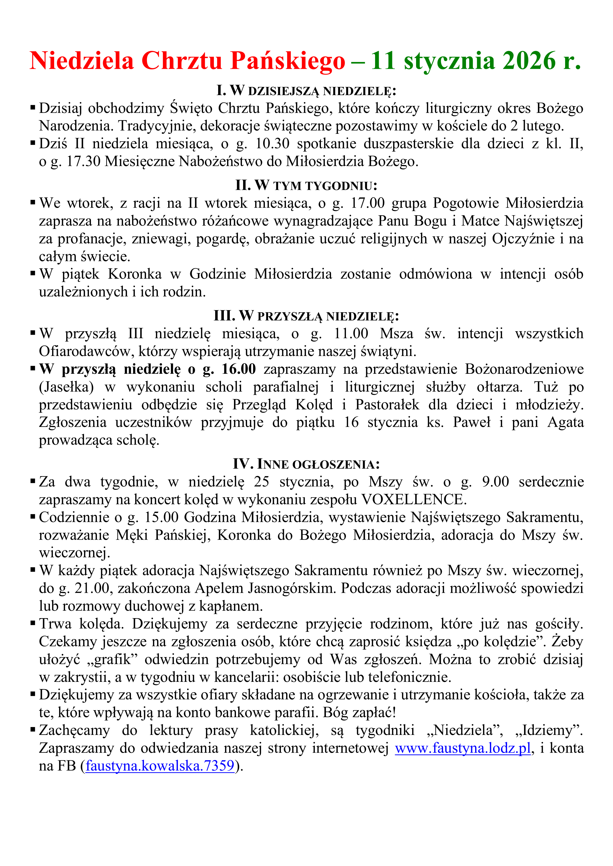 • Zachęcamy do lektury prasy katolickiej, są tygodniki „Niedziela”, „Idziemy” i inne. Są też do nabycia książeczki poświęcone Najświętszemu Sercu Pana Jezusa. Zapraszamy do odwiedzania naszej strony internetowej faustyna.lodz.pl, i konta na FB (faustyna.kowalska.7359).